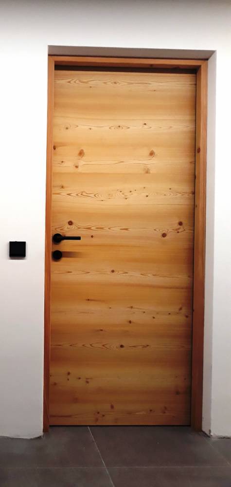Porta interna con telaio a imbotte impiallacciata in larice senza nodi, oliato e fresata a "V"